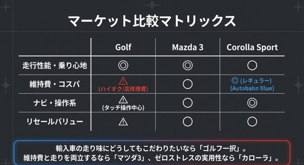 • 維持費・操作系・リセールを重視するならマツダ3・カローラスポーツも比較検討を